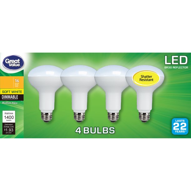 Great Value Led Light Bulb 16w 100w Equivalent Br30 Floodlight Lamp E26 Medium Base Dimmable Soft White 4 Pack Walmart Com Walmart Com