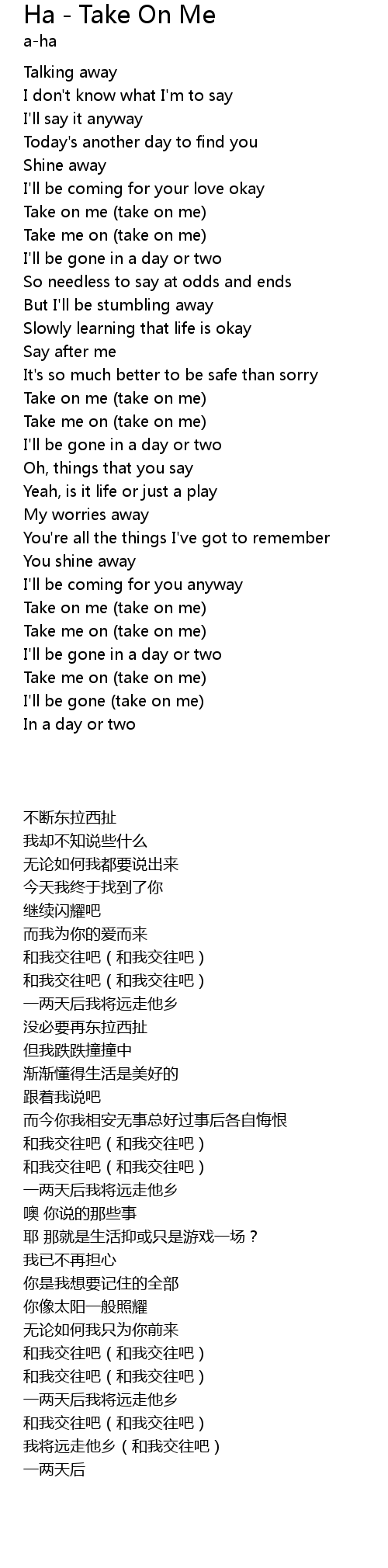 Today Is Another Day To Find You Take On Me Take Me On Aha Take On Me Lyrics Me Too Lyrics Music Lyrics