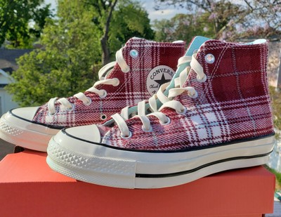 New Converse Chuck Taylor All Star Plaid Hi Top Sneakers Burgundy Cyan Ivory Ebay